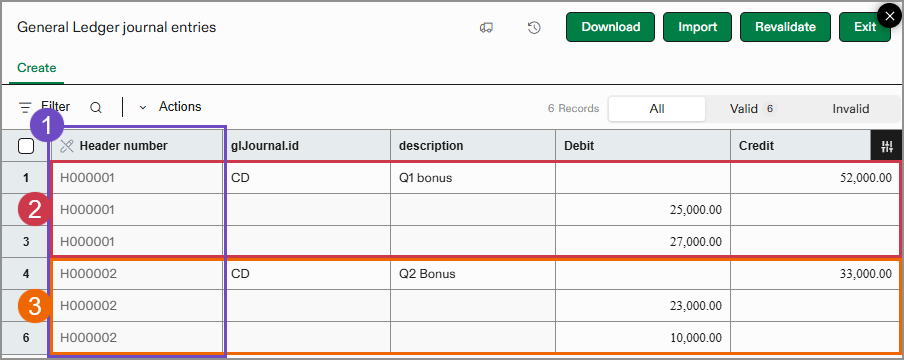 The header number column automatically assigns a non-editable number to lines in your import. This column is intended to help identify and keep sets of information together, such as lines in a journal entry. Header numbers are not imported into Intacct, but rather serve as a way to keep groups of information together, indicate line errors, and troubleshoot issues.