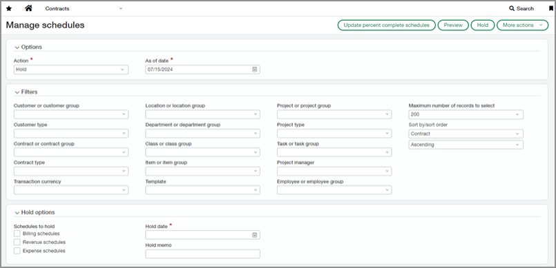 We've added the ability to hold and resume schedules from the Manage Schedules page. Now you can manually hold or resume billing, revenue, and expense schedules in bulk across multiple contracts, eliminating the need to access each contract individually. When you hold or resume contract line schedules, Intacct creates a bulk action run record and runs the process offline.
