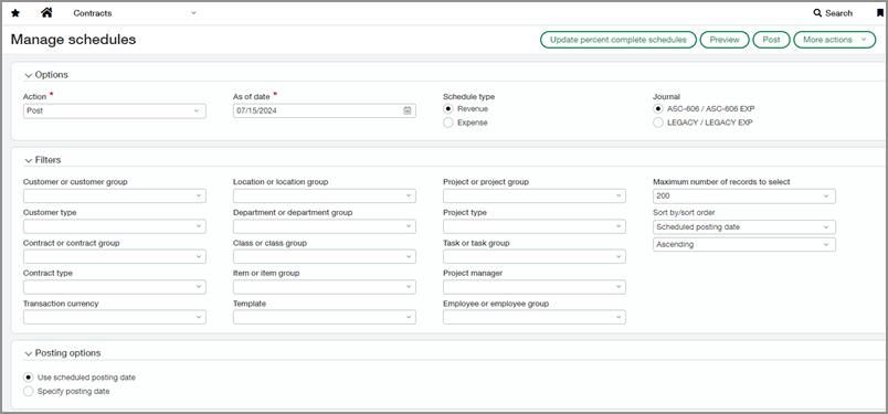 For the Post action, you now select either the Revenue or Expense schedule type. When you select Preview, a single filtered results list appears, making it easier to manage.
