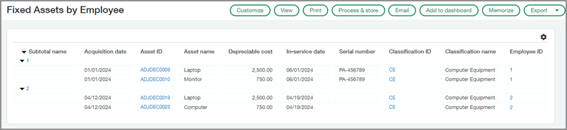 Fixed Assets by Employee: Displays a list of assets grouped by employee, along with additional details about the assets.
