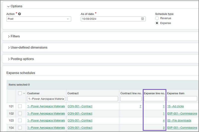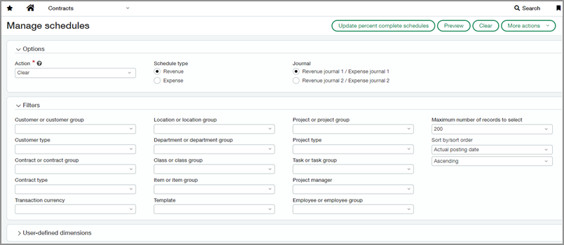 We added support for user-defined dimensions on the Manage Schedules page, giving you more ways to refine the list of schedules or contract lines on which you want to act. The new User-defined dimensions section is located under the Filters section.