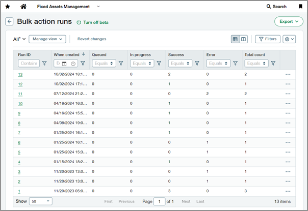 Enhanced lists are available on the Bulk Action Runs and Asset Groups pages. These pages now align with the rest of the Fixed Assets Management application.