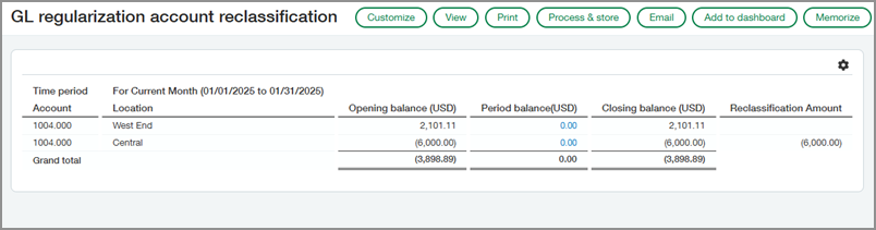 If you view or print the report, you'll have the option to create draft journal entries to move the account balance from the regularization accounts to their reclassification accounts.