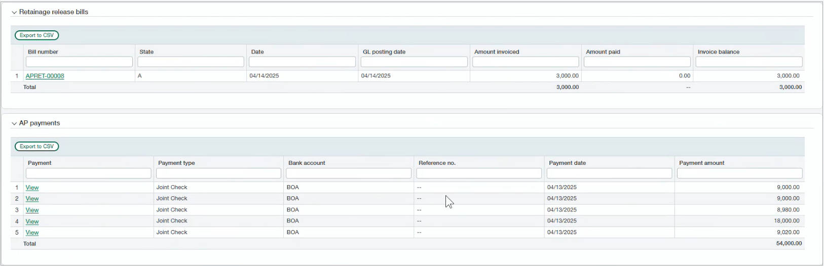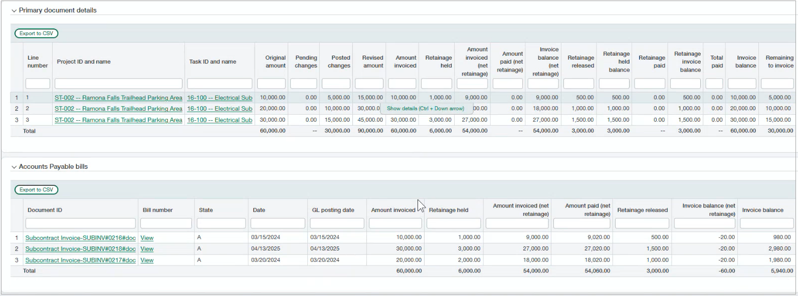 View a summary of all transactions for the document, then scroll to the details where you can drill into AP bills, retainage release bills, and AP payments.
