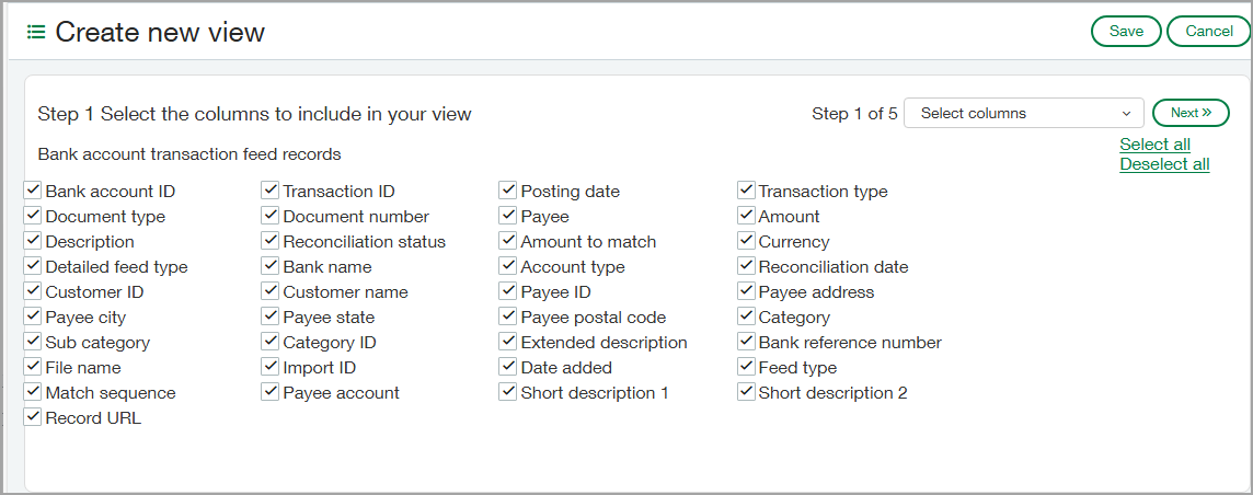 In addition, when viewing bank transactions or creating new views, select from the expanded range of fields to customize how you view bank transaction lists.