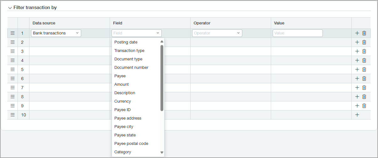 The following new fields are now available for you to select when the selected data source is Bank transactions. These fields are available when you’re creating matching and creation rules or assignment rules. They’re also available when viewing bank transaction and creating new views.